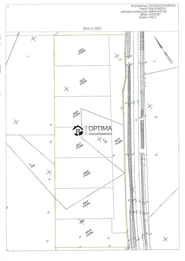 Należy wykonać własną studnię i zbiornik bezodpływowy. Prąd znajduje się przy granicy działki 400/11. W cenę działki wliczony jest udział w działce drogowej.